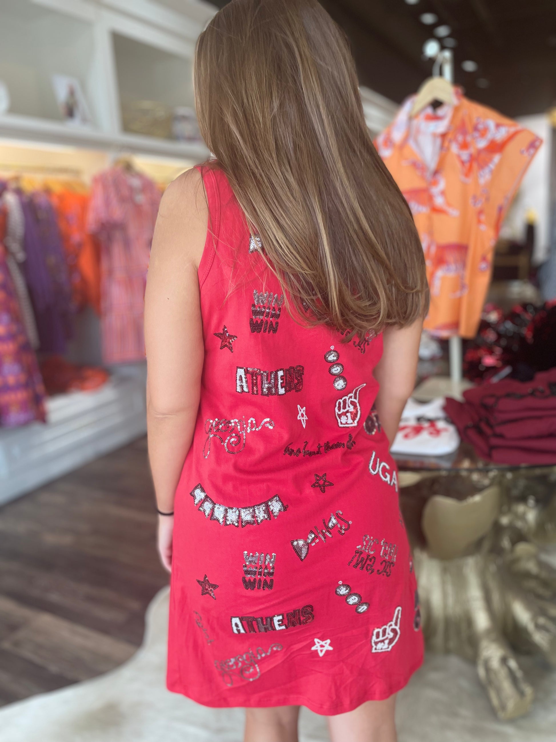 Sleeveless dress in cotton jersey fabric with full sequin school logos and phrases