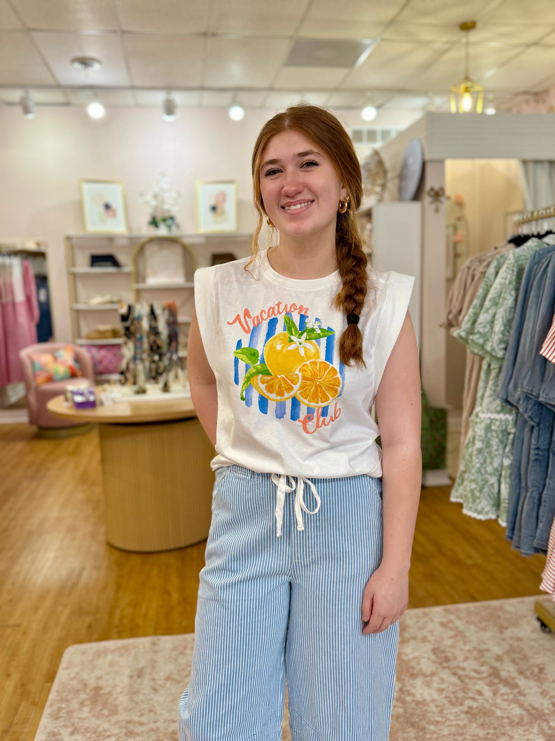 The Vacation Club Embroidered Muscle Tee is laid-back, sunny, and just the right amount of cool. Crafted from lightweight 100% cotton, this white muscle tee features a center graphic of crisp blue stripes with a bright orange at the heart — finished with “Vacation Club” embroidered in soft peach thread for a subtle pop of color. Easy, breathable, and endlessly wearable, it’s the kind of tee that instantly puts you in a relaxed, getaway state of mind.