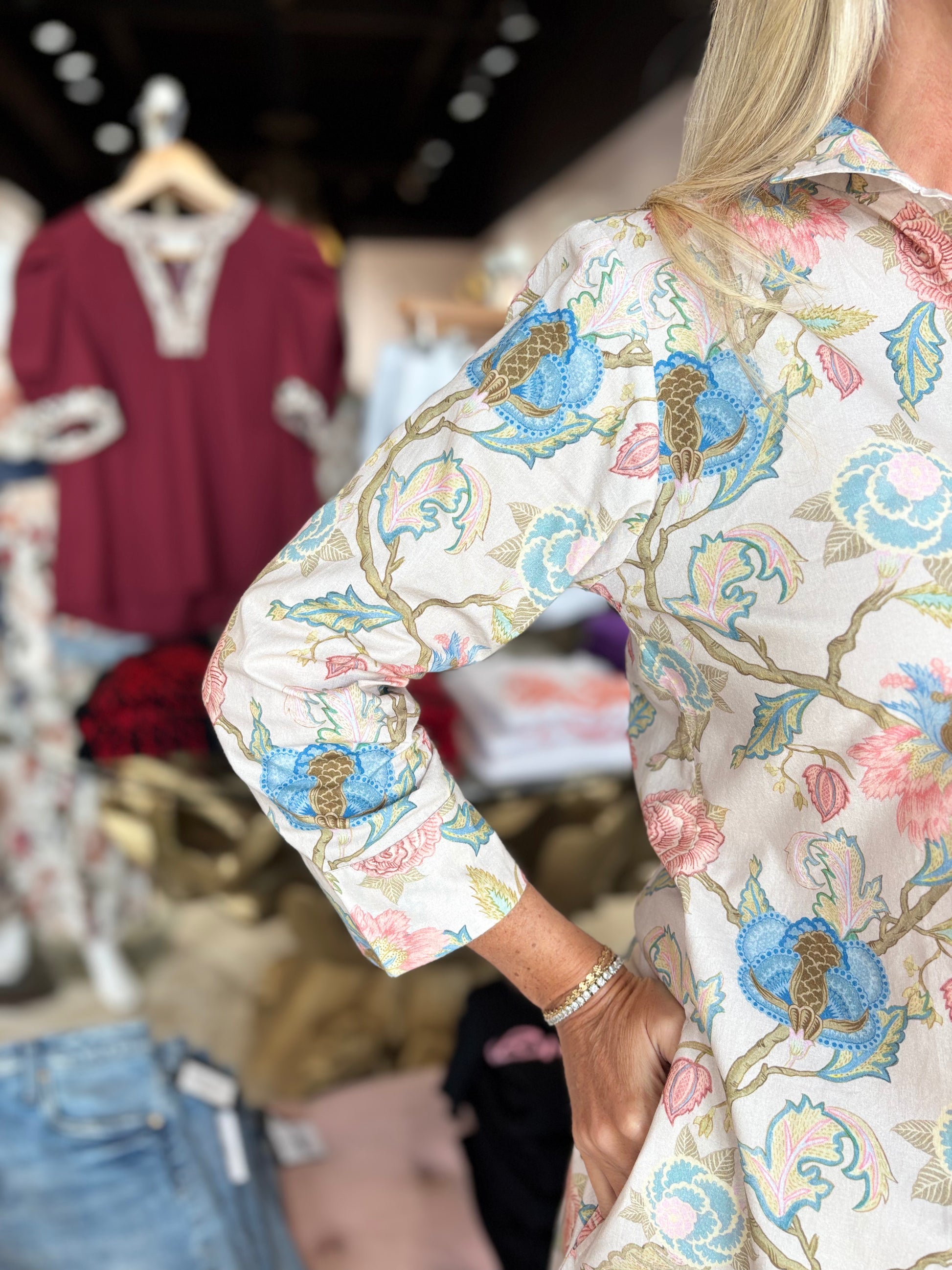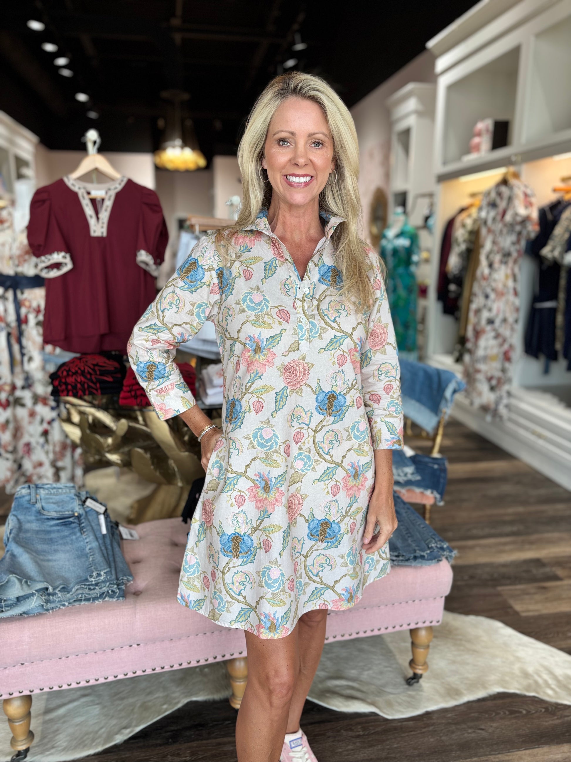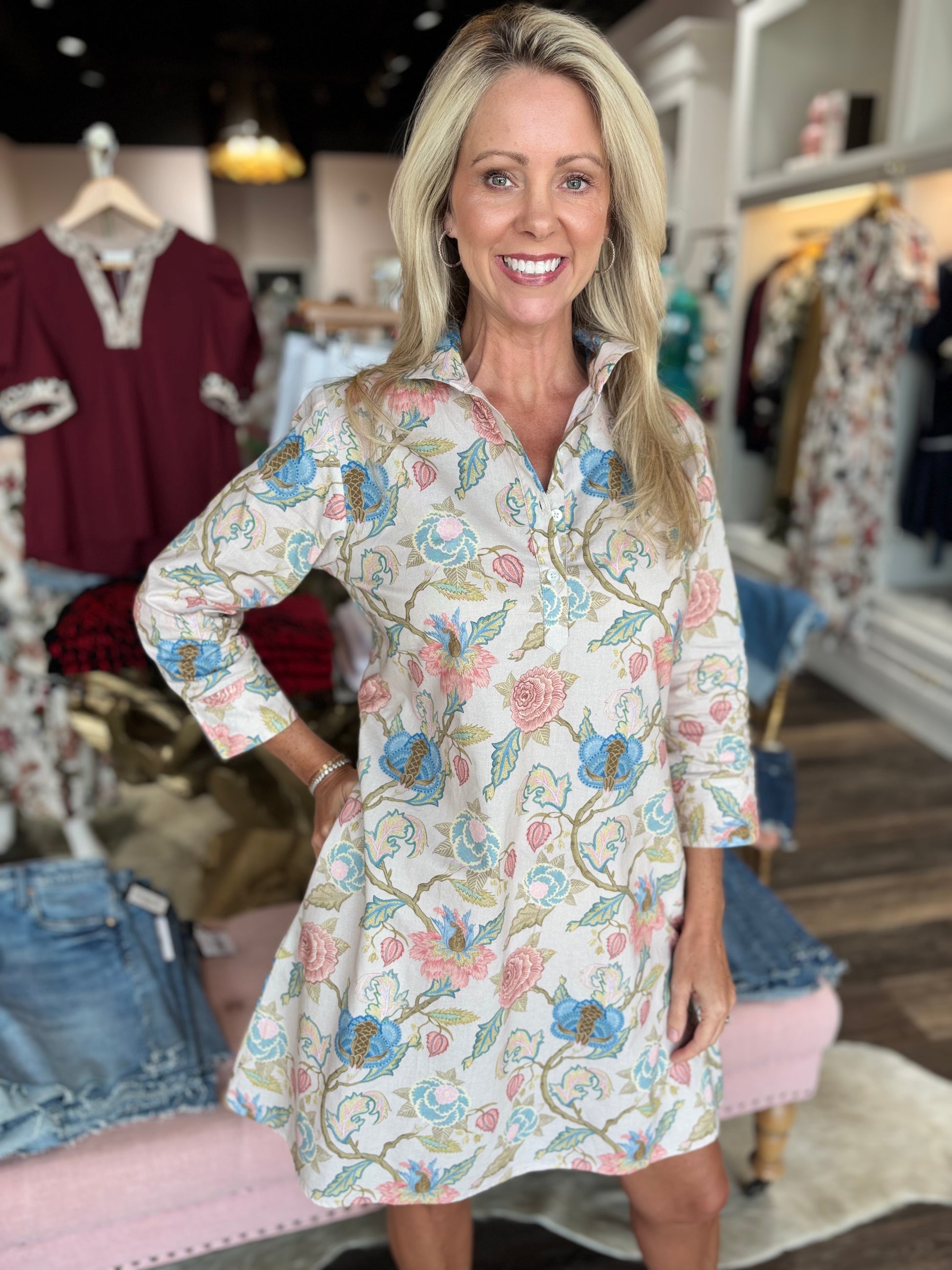 The Cordelia features a quarter button down design and 3/4 sleeves. The perfect everyday dress.