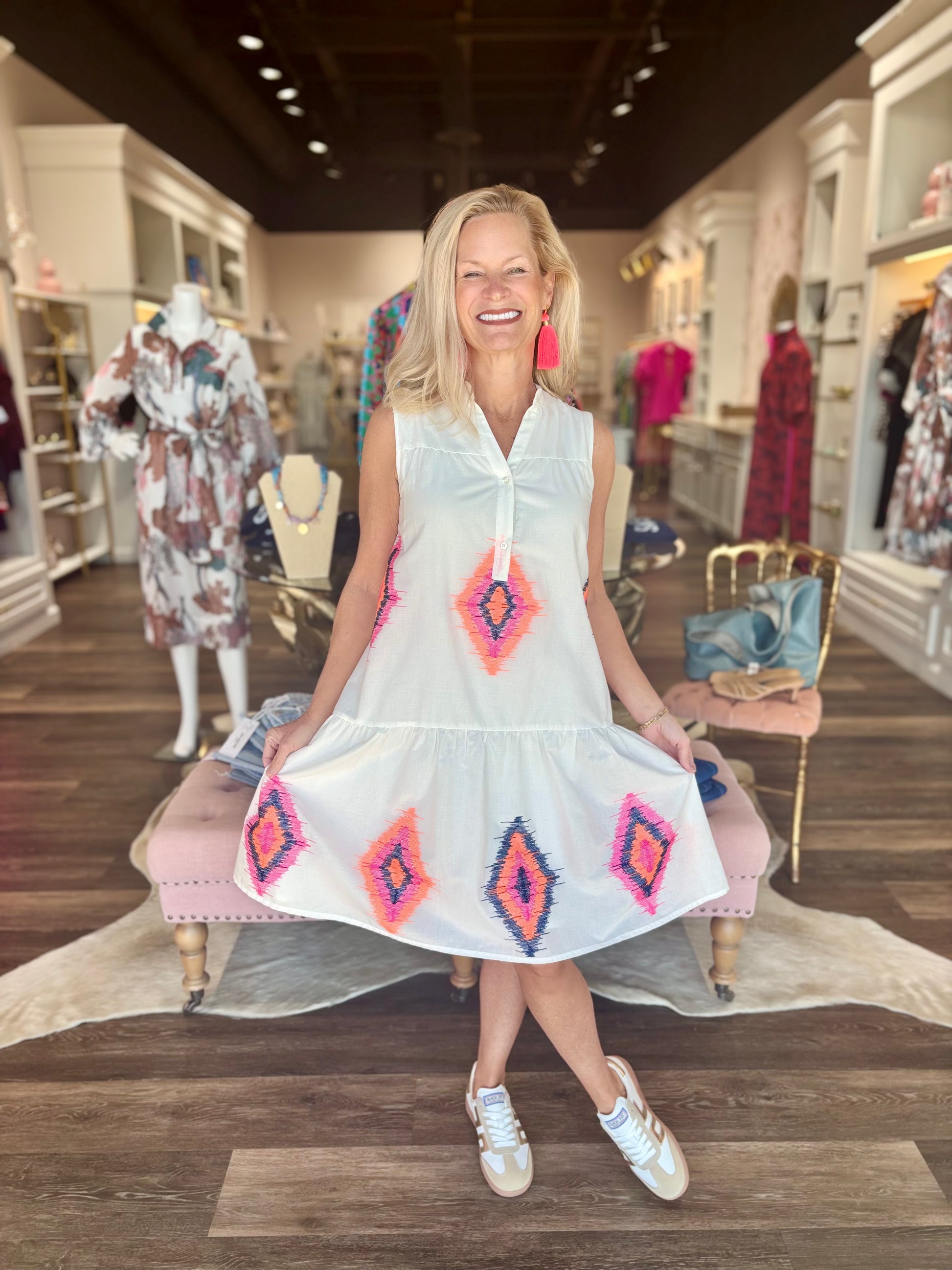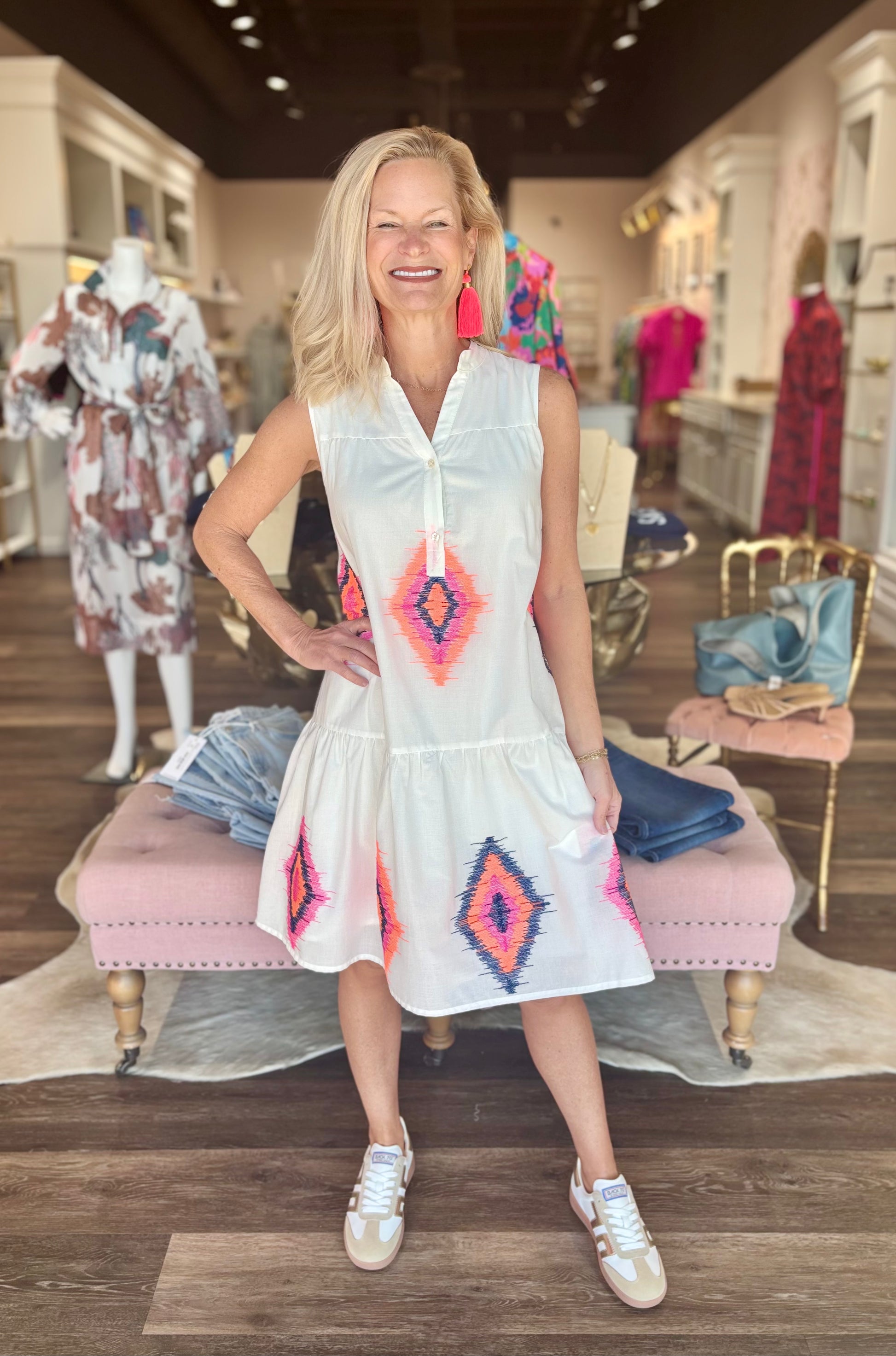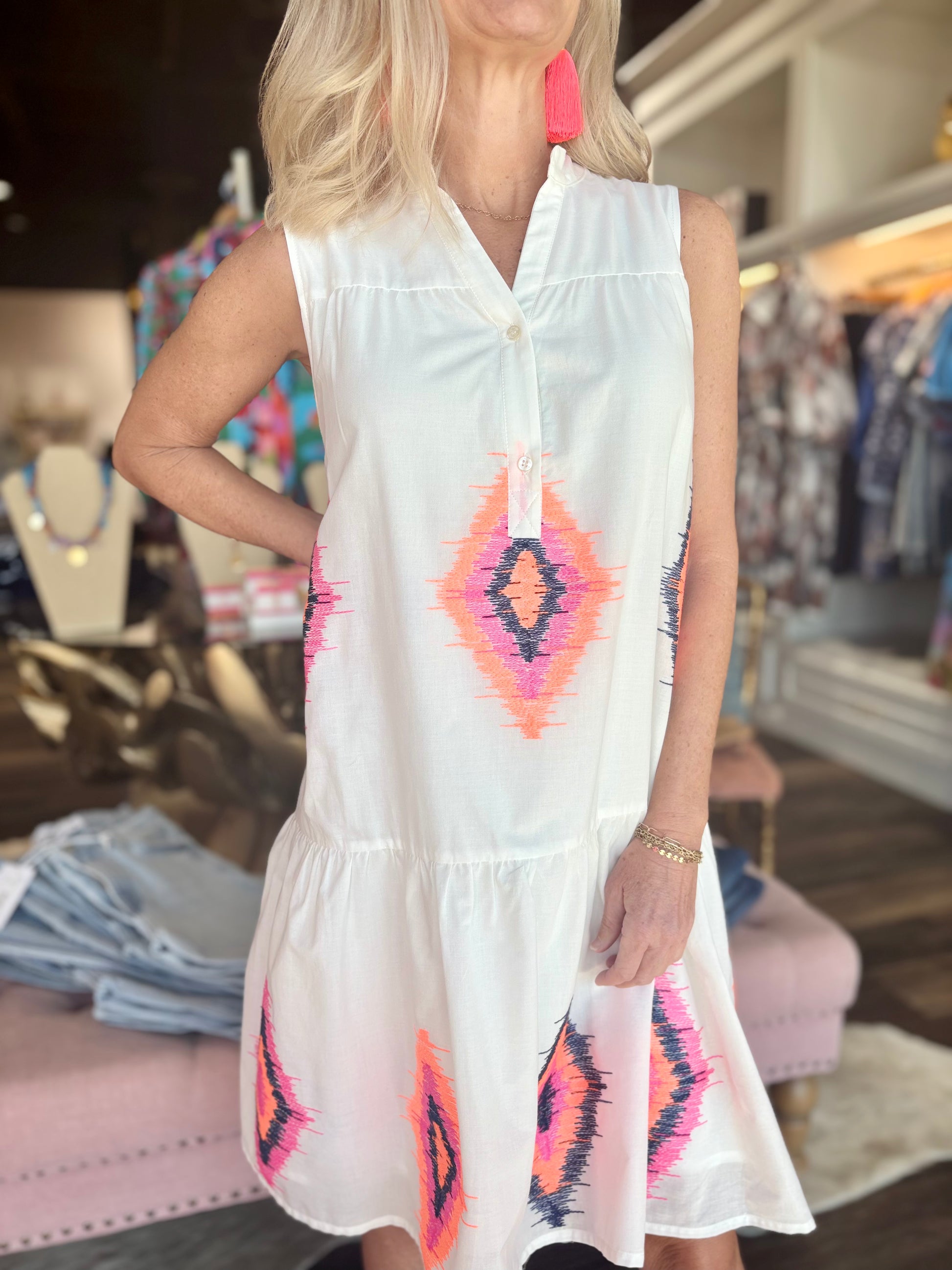 White dress with ikat embroidery in fluorescent colors.