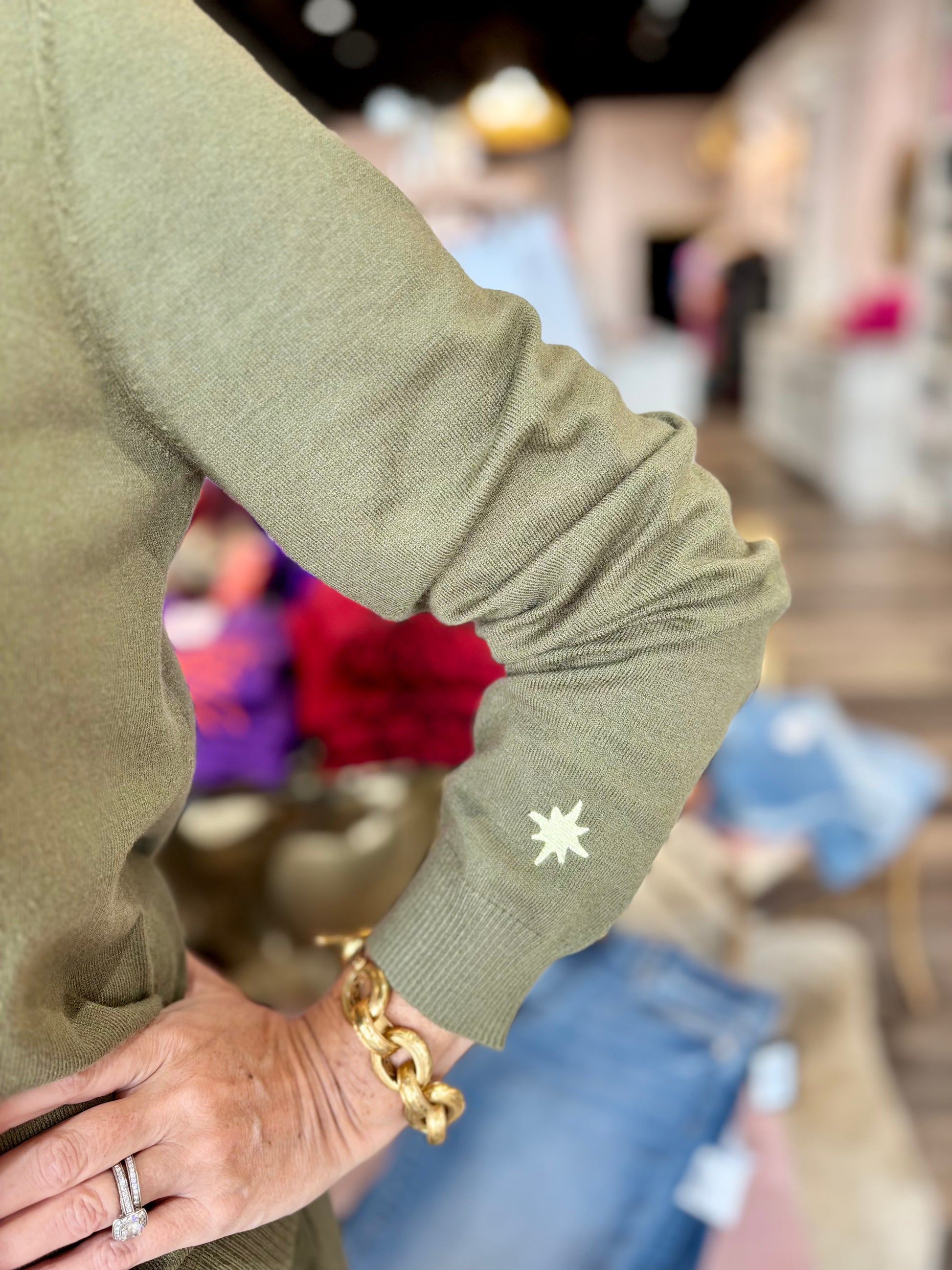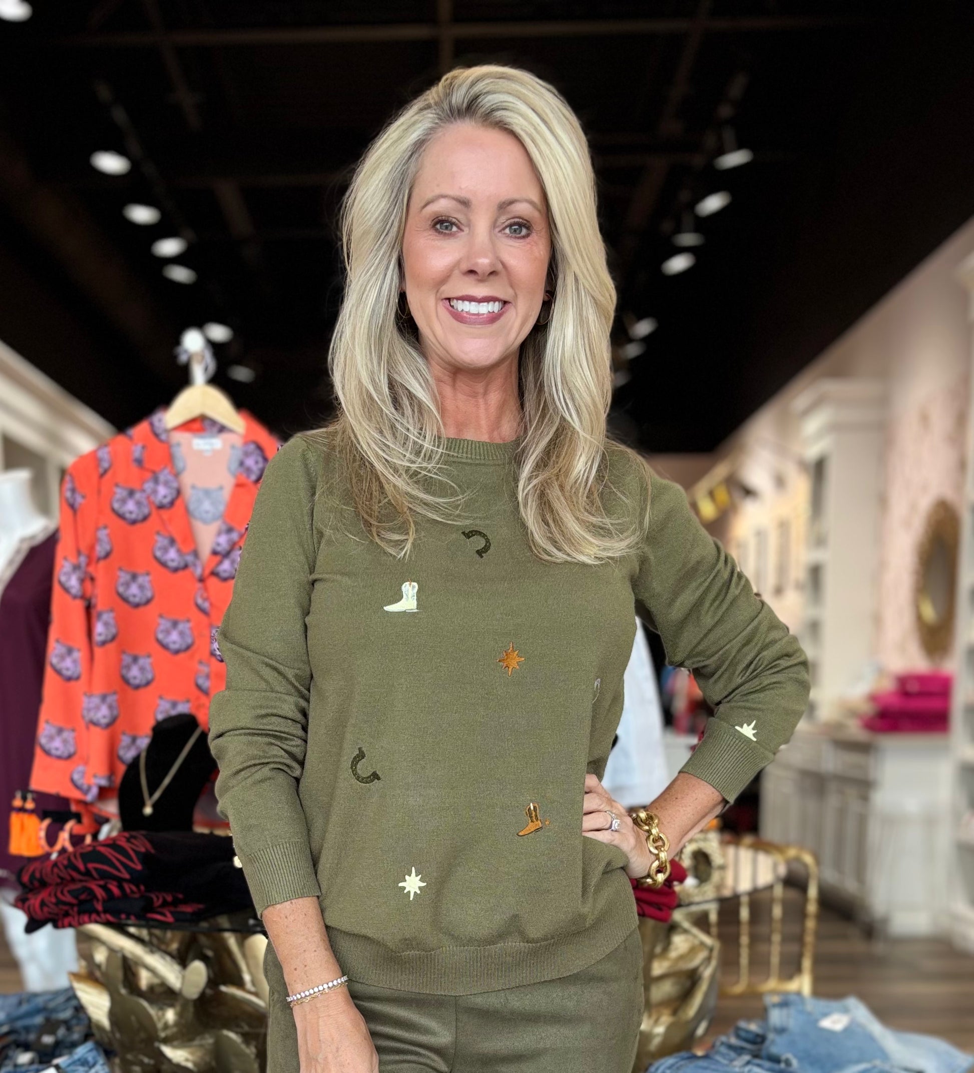 Soft and lightweight, this olive green sweater features a charming Western-inspired design with stitched boots and lucky horseshoes. The relaxed fit and ribbed trim make it perfect for layering on crisp days or pairing with jeans for a casual, rustic look.